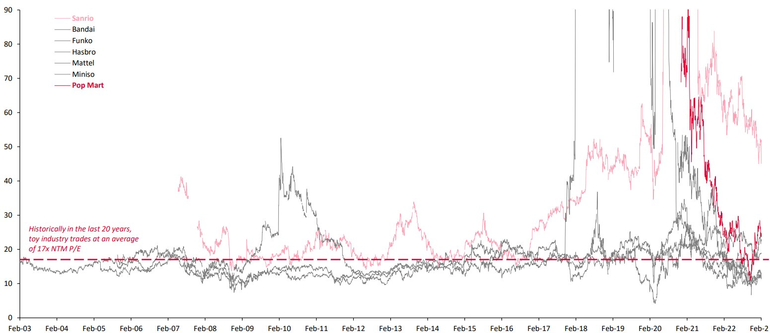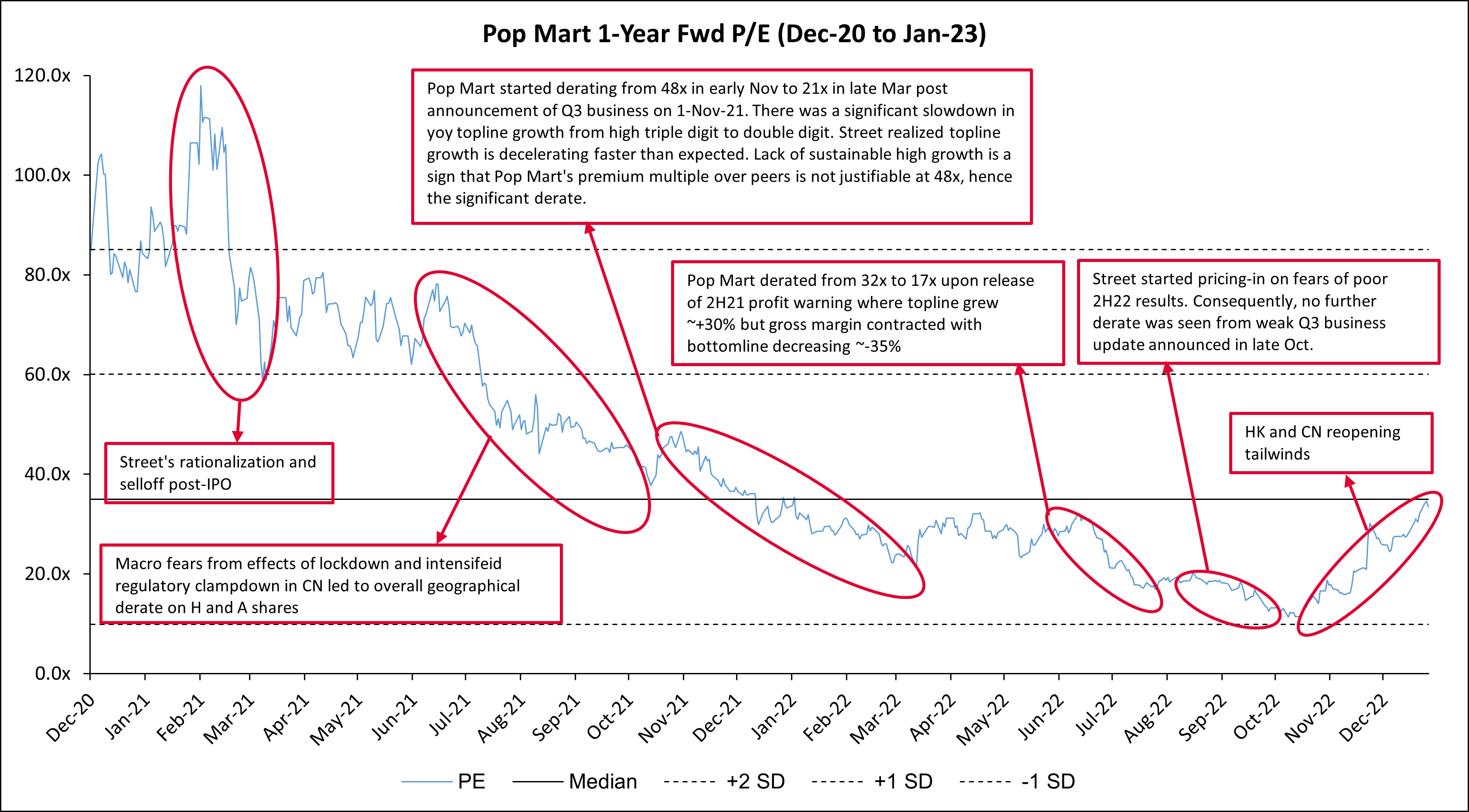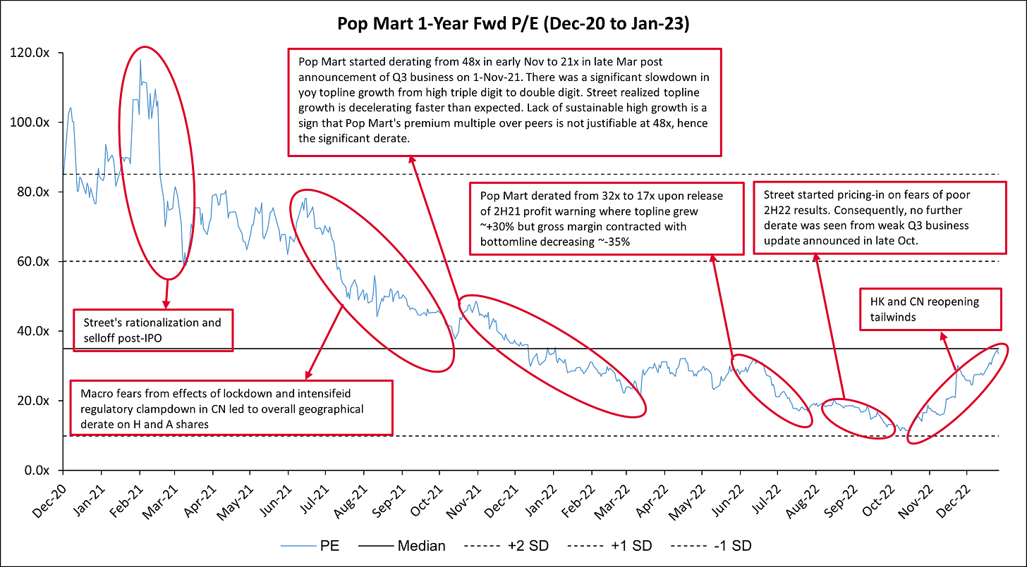 It is worth mentioning that consensus has always overestimated Pop Mart’s actual earnings since its listing. I think a more realistic expectation would be 70-120 new stores and 300-500 new Roboshops per year for FY23-25E with 250-300bps of erosion on margins due to increased shipping costs and sales & distribution costs from Pop Mart’s overseas expansion. From late Aug-22 to early Nov-22, Pop Mart’s P/E derated from 21x to 11x. It is likely street has priced in a weak set of results for 2H22E. From Dec-22 to Jan-23, Pop Mart’s P/E rerated from 15x to 28x purely due to tailwinds of China’s reopening with no changes on fundamentals.