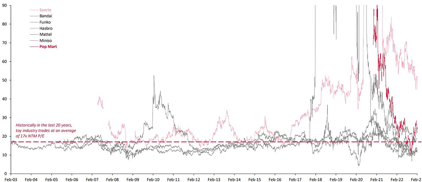 2. Potential listing of competitors KK Group and 52TOYS. Both KK Group and 52TOYS are pop toy companies based out of China and are direct competitors to Pop Mart. 52TOYS previously completed a RMB400mn of series C financing back in Sep-21 and teased the idea of exploring an IPO to fund growth. KK Group submitted an application on 23rd Jan to list on the HKEx, with Morgan Stanley and Credit Suisse as joint sponsors. Progress on competitors’ IPO plans could drive institutional investors to rotate out of Pop Mart to other pop toy competitors.